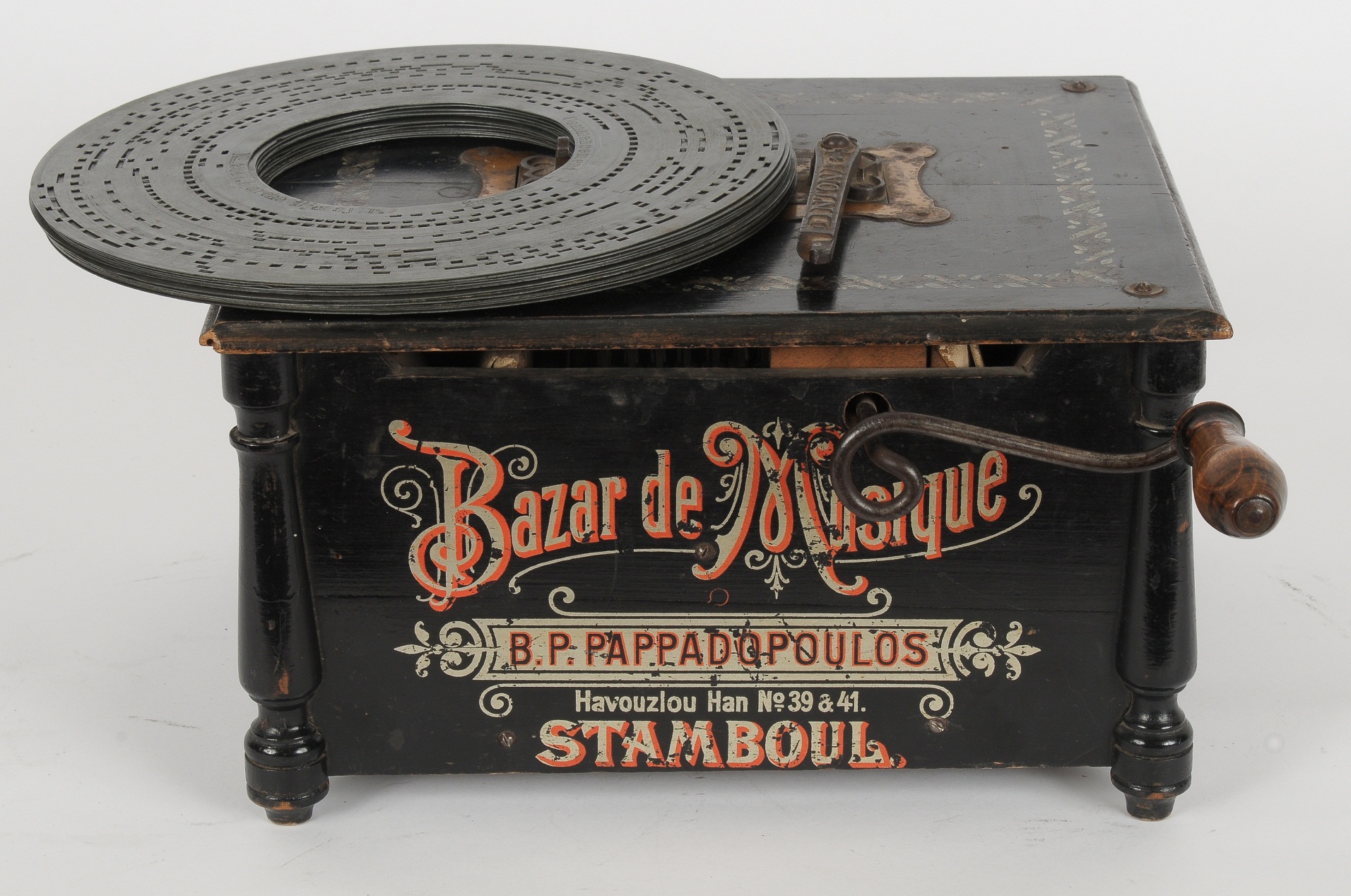 Osmanlı İstanbul pazarı için özel üretilmiş Laterna. 14 orijinal sac plakları ile birlikte. Üzerinde “Bazar de Musique, B.P.Pappadopoulos, Havouzlou Han No:39 & 41, Stamboul” yazmaktadır. Nadir bulunan ölçülerde, çalışır durumda ve mükemmel kondisyondadır.
