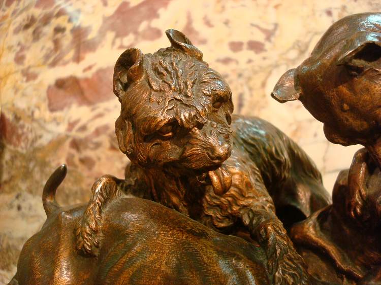 Fransız heykeltraş P.J.Mene imzalı avlanan üç köpek betimlemeli bronz heykel.